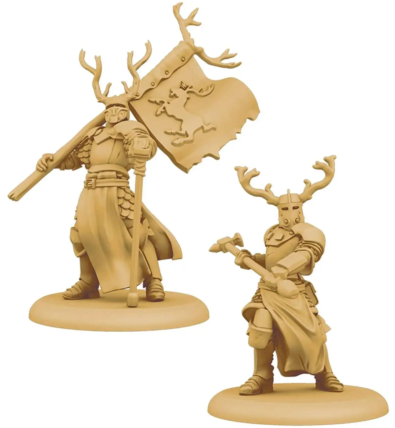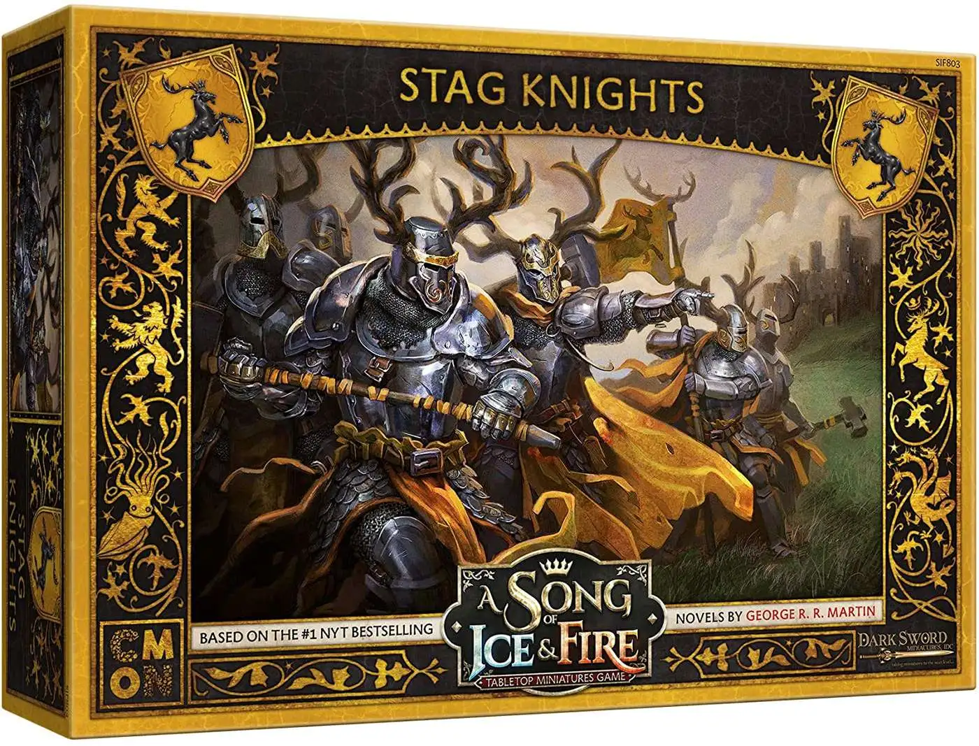 The Stag Knights unit box for the A Song of Ice and Fire: Tabletop Miniatures Game gives House Baratheon commanders a strong, tough, elite unit for their forces. Clad in heavy armor, letting them take a significant blow from the enemy and coming out fine, as the unit does take damage, it only grows stronger. As ranks are destroyed, the unit gains access to several special abilities, each one as deadly as the last.