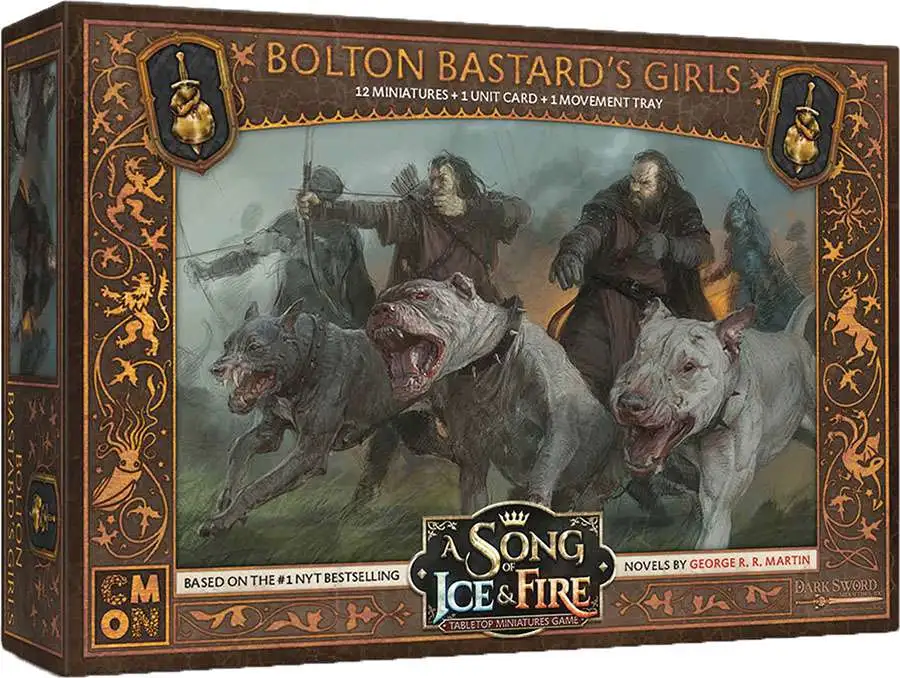 Dogs have been used as part of the hunt for hundreds of years. Their keen sense of smell, swift running speed, and vicious bite have helped man put food on the table since their domestication. House Bolton, though, has trained dogs to not just hunt wild game, but men out on the field of battle. Accompanied by handlers, whose arrows help slow their prey, the dogs are quick to chew apart anyone they catch. The Bastards Girls Unit Box for the A Song of Ice and Fire: Tabletop Miniatures Game allows Commanders to field this squad as part of their force. Being a Neutral unit, any other house can hire them on. Lightly armored, these swift hunters can easily take down enemies with a combination of arrows and teeth.