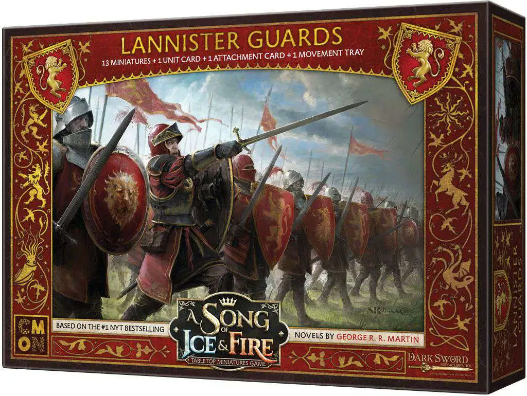 The A Song of Ice and Fire: Tabletop Miniatures Game Lannister Guards unit boxes come with 12 Lannister Guard figures, one Guard Captain Unit Attachment, a Movement Tray, and all associated Unit cards. These soldiers are not the fastest, or even the strongest in the war. What they do have is an incredible level of defense, giving them the ability to wear their opponents down. Wars are won by those with the will to continue fighting.