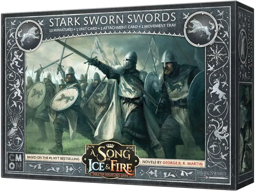 The A Song of Ice and Fire: Tabletop Miniatures Game Stark Sworn Swords unit box contains 12 miniature Sworn Sword figures, one Sworn Sword Unit Attachment, a Movement Tray, and all associated Unit cards. These warriors have waited in the frozen North too long, dreaming of battle. They may not be the best equipped units in the war, but they know that shiny armor and pretty swords alone do not make a soldier.