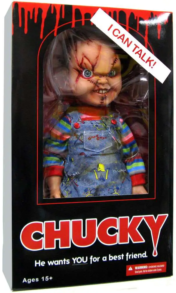 The star of five CHILDS PLAY films, Mezcos Chucky stands 15″ tall and features real cloth Good Guys clothing, 11 points of articulation and his trademark orange hair. He also talks. With seven spine-chilling phrases pulled directly from the films, this Chucky is guaranteed to thrill.