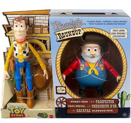 This pack captures the scene from Disney and Pixar’s Toy Story 2 when Woody and Stinky Pete first meet at Al’s Toy Barn. It features two action figures — Woody at 9.2-inches (23.4-cm) and Stinky Pete at 6.75-inches (17.1-cm). Both character figures have movable joints for dynamic play or a classic display. The special packaging sets the scene, inspired by Stinky Pete’s actual box in the movie. The friendly sheriff and the villainous prospector will make a playful pair for kids or a great addition to a Toy Story collection. Makes a great gift for fans and collectors ages 3 years and older.