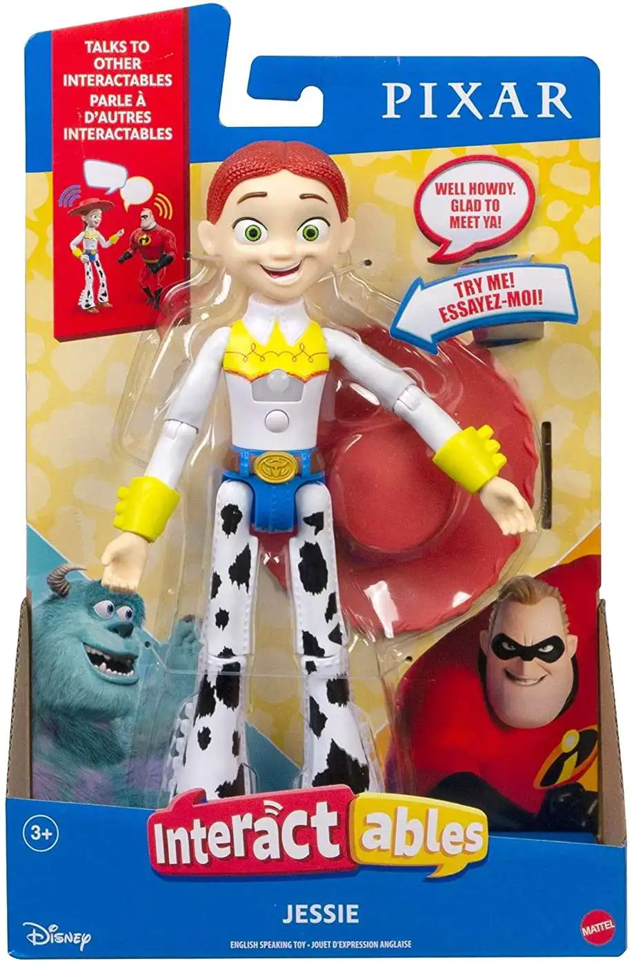 This Jessie Interactables figure not only recognizes the Toy Story gang, but also greets and converses with characters from across the Pixar universe! Whether shes reliving past adventures with friends and foes from Toy Story or greeting a new encounter from a different Disney and Pixar movie, she can inspire free-spirited cross-movie conversation and play! Shes got something to say to everyone – just turn her on and listen. The 8.8-inch (22.4-cm) tall talking Jessie figure is also highly posable to recreate signature cowgirl moves or star in a multi-character display. Colors and decorations may vary.