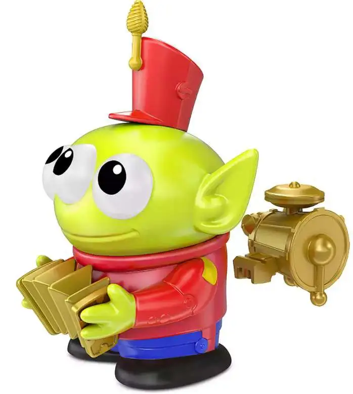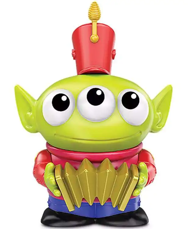 The band’s all here! Toy Story’s adorable green Alien dressed as Tinny from the Disney and Pixar short Tin Toy. In addition to the squeeze box in front, this galaxy invader comes with a drum and instrument set that attaches in the back.