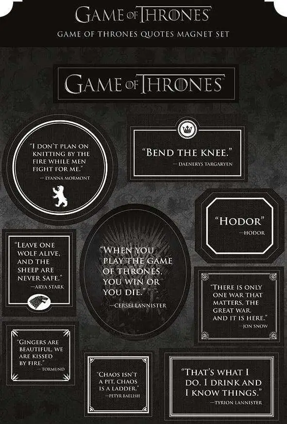 Commemorate legendary moments from HBO’s Game of Thrones with these magnets featuring quotes from Jon Snow, Arya Stark, fan favorite Lyanna Mormont, and more! A perfect addition to any collector’s kitchen or great hall.