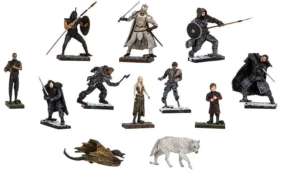 Series 1 figures includes Jon Snow, Ghost, Daenerys Targaryen, Rhaegal, Tyrion Lannister, Grey Worm, Kingsguard, Wildling with axe, Wildling with spear, Wight with sword, Unsullied (attacking), and Crow (defending). (figures vary)