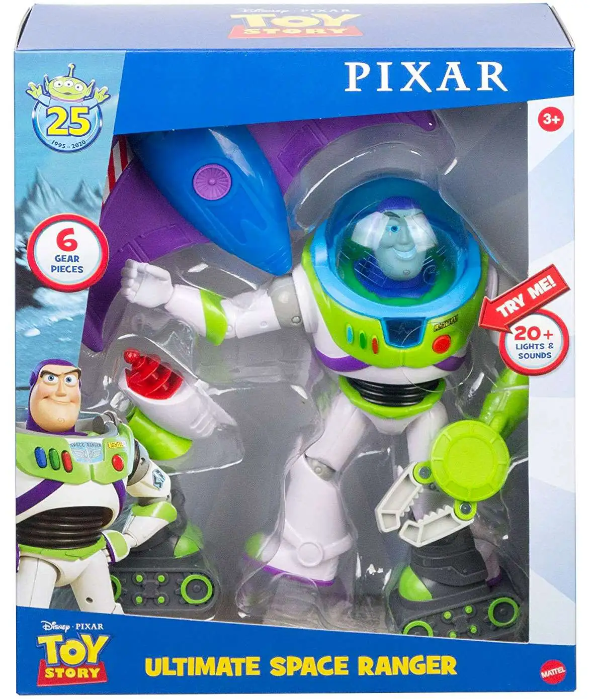 Prepare for epic missions in far off galaxies with Buzz Lightyear! This Ultimate Space Ranger action figure comes packed with iconic gear and special features for realistic Disney and Pixar’s Toy Story play. His chest controls light up as he says signature lines like “Greetings, Space Ranger. We have a mission!” Authentic accessories include his signature hyperspace wing and jet pack, moon boots, a helmet with a visor, a blaster and a claw to crush zurgbots! Exciting movie sounds include laser firing and jet engine launching. Join Ultimate Buzz Lightyear as he rescues his friends and soars off on intergalactic adventures! For ages 3 and up.