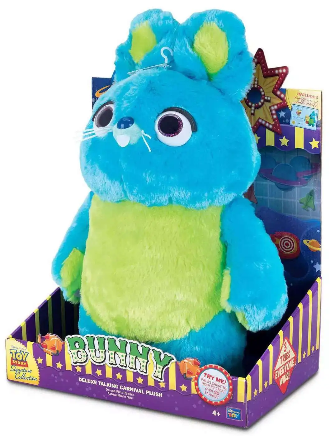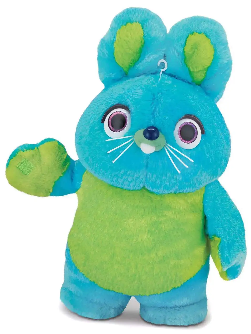 Woody’s journey in Toy Story 4 includes a visit to a carnival where he meets Ducky and Bunny, two carnival prizes who are eager to be won. But when their plans are rudely interrupted by Woody and his friends, they find themselves on an unexpected adventure with a group of toys who have no idea what it feels like to be tacked to a prize wall. Press chest button to activate voice. Has fastner on his paw so he can hold Ducky’s wing tip (Ducky sold separately).