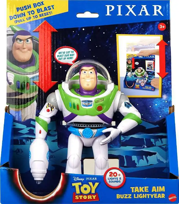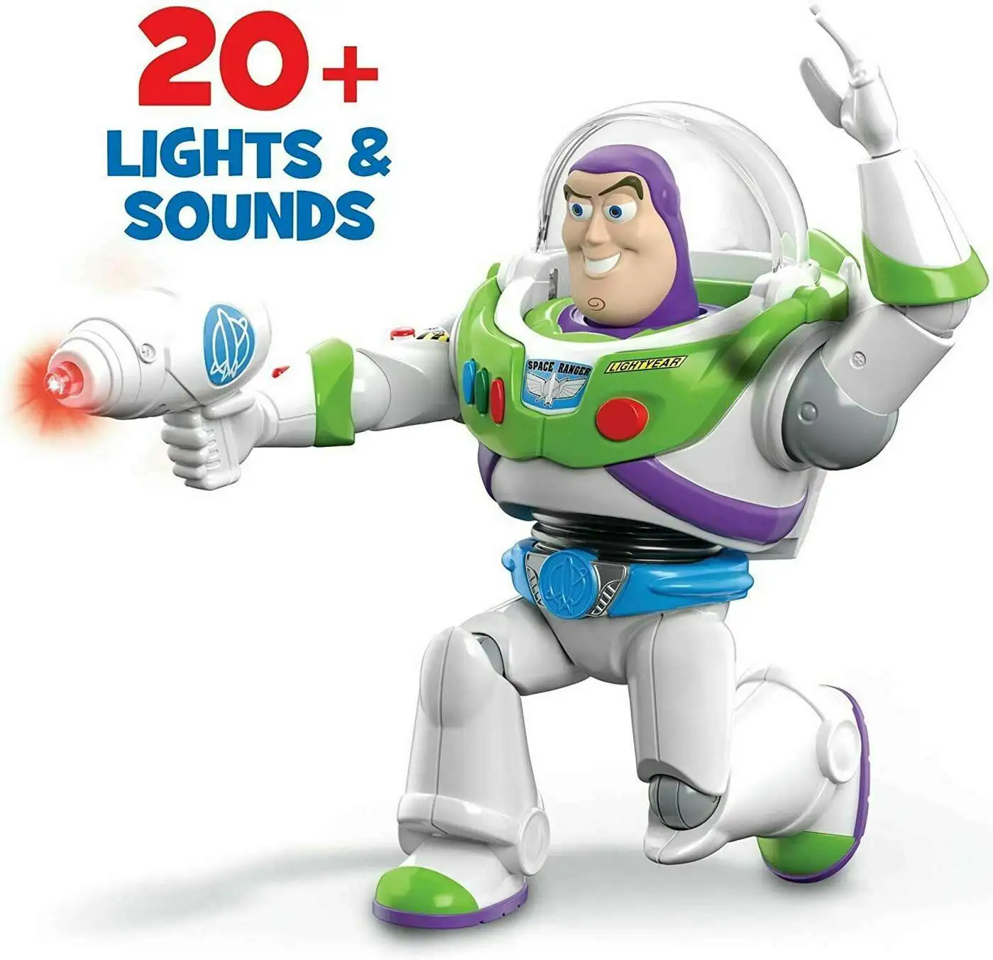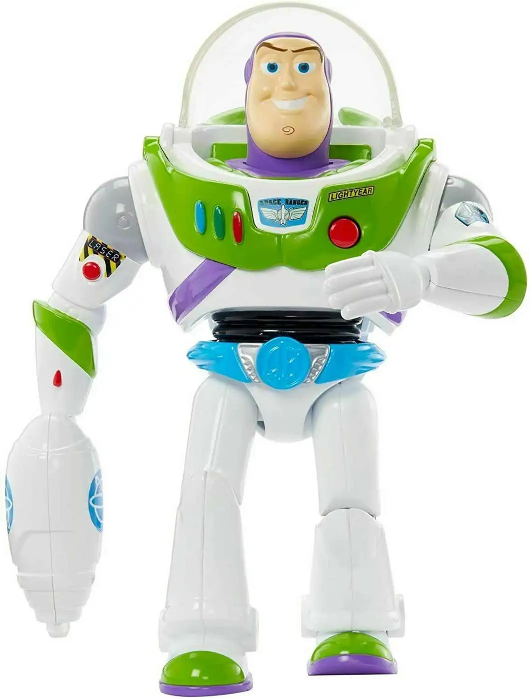Buzz Lightyear is ready to defend the galaxy and take on evildoers with his space ranger standard issue blaster.
